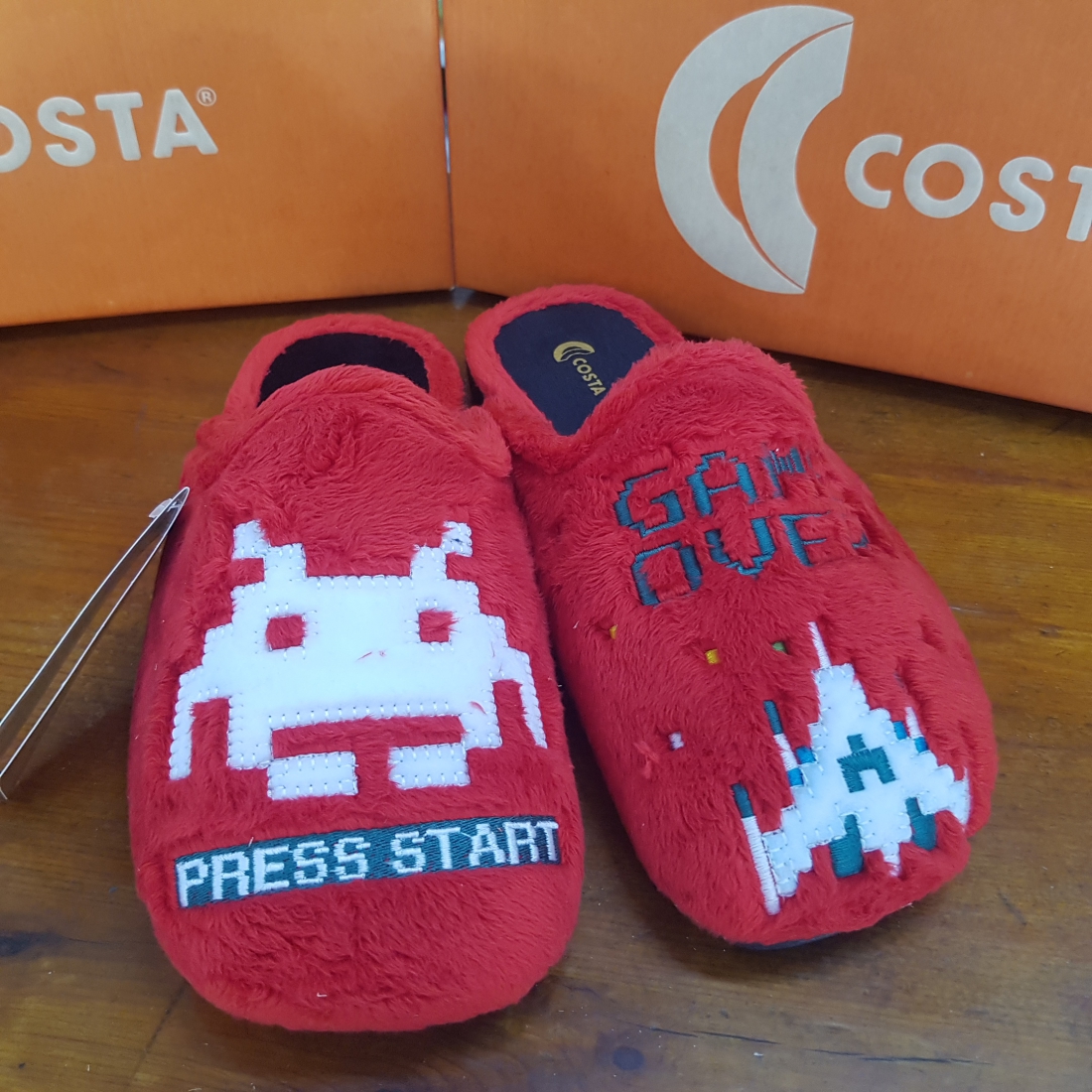 Zapatilla caballero descubierta invierno en color rojo, dibujo video juegos marcianos GAME OVER, suela de goma.